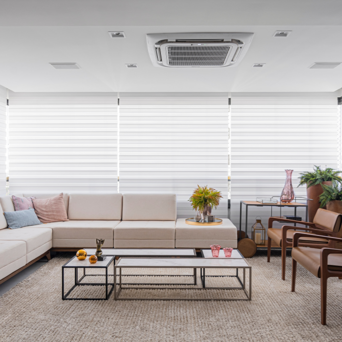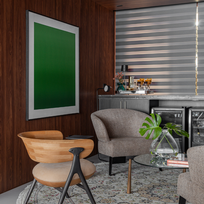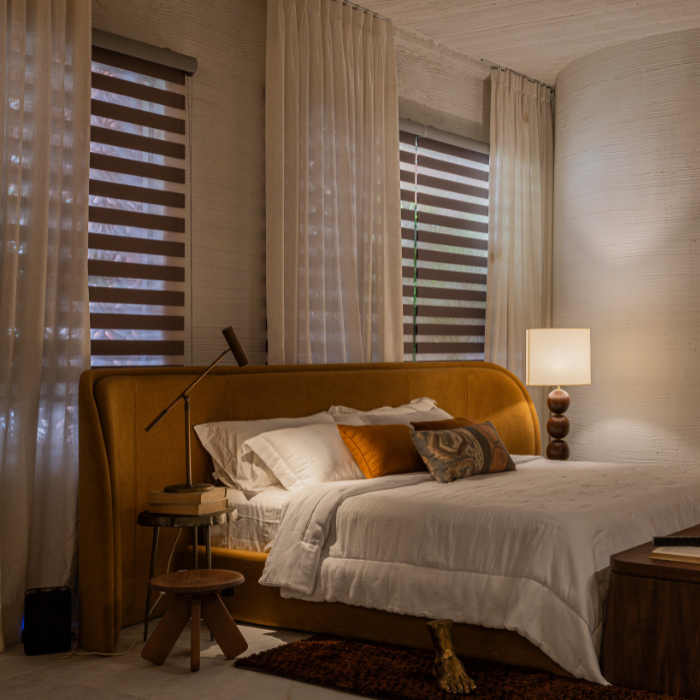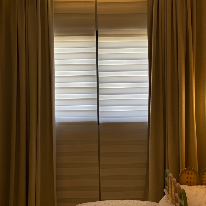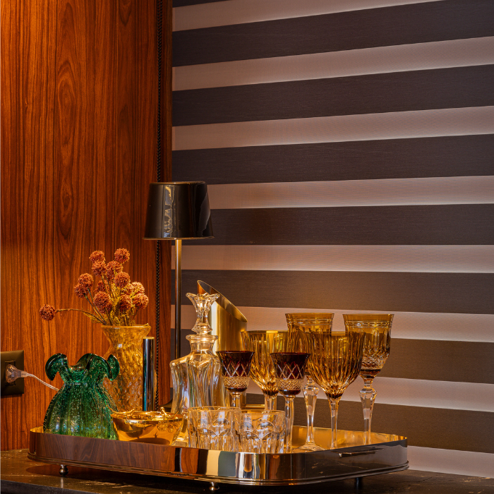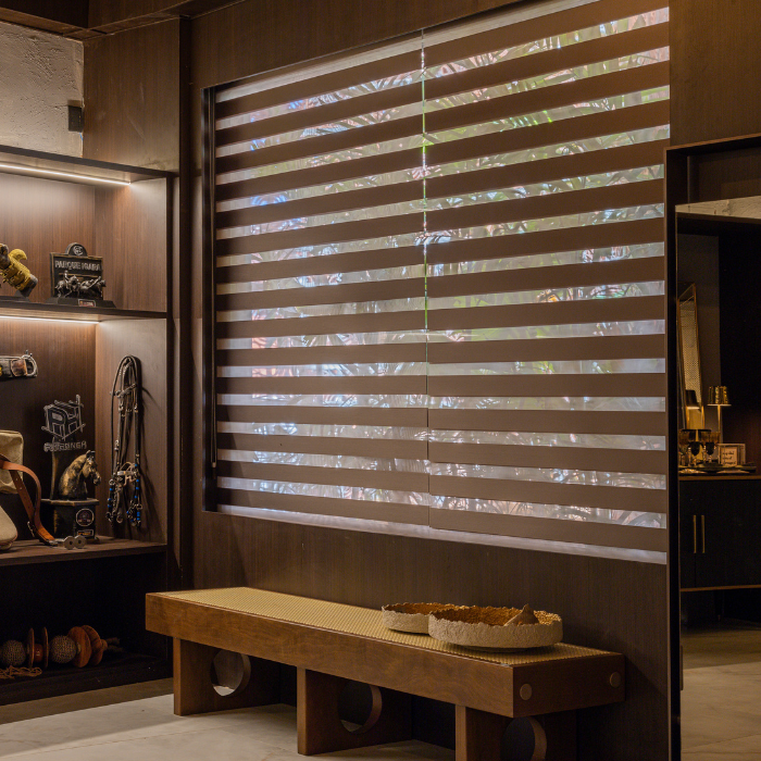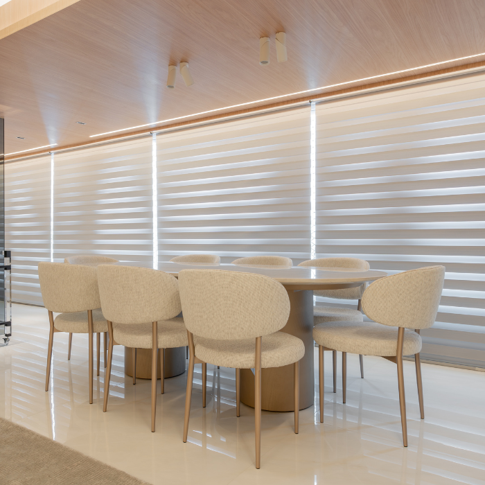 Cortina com design contemporâneo composta por dupla lâmina de tecido, que alterna transparência e opacidade, possibilitando diversas posições que favorecem privacidade e visibilidade conforme manuseio, além de permitir recolhimento total.