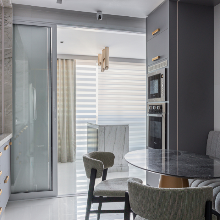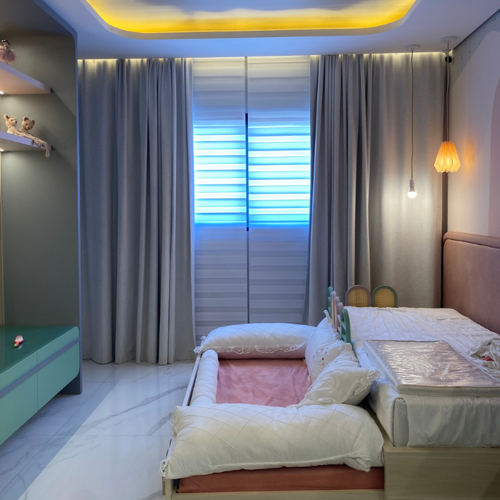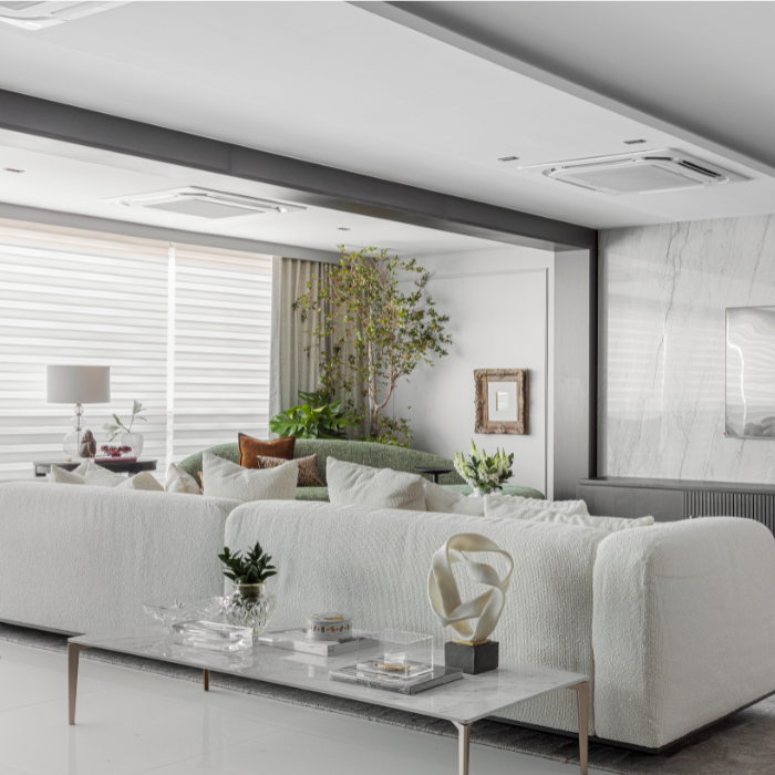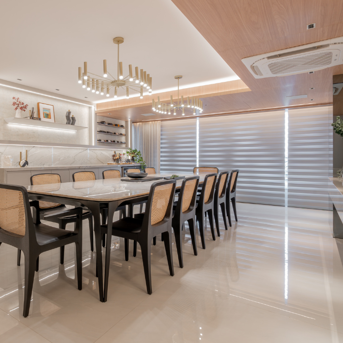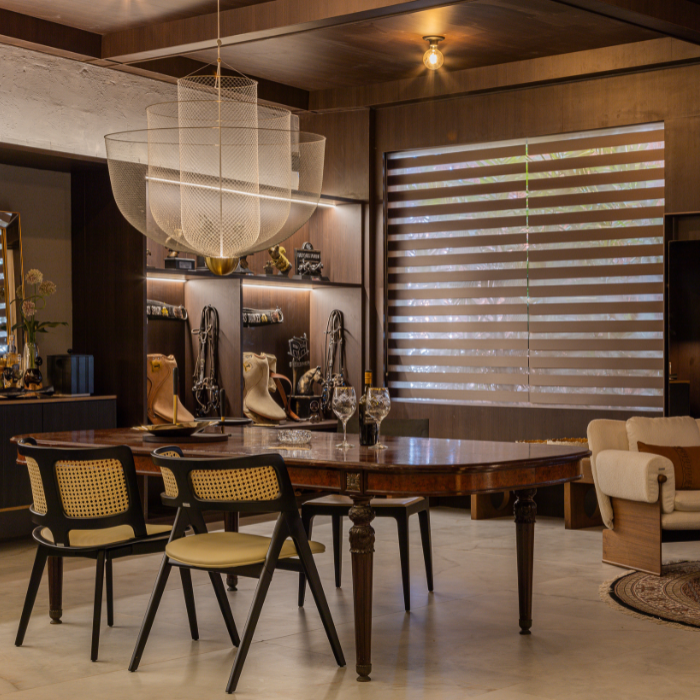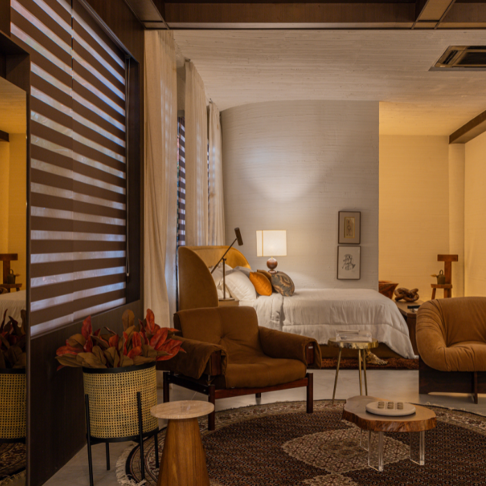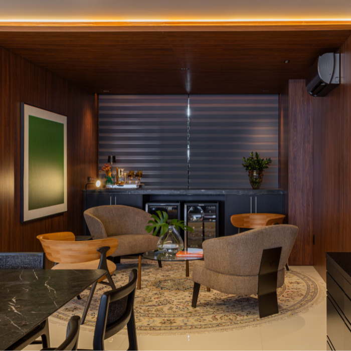 Cortina com design contemporâneo composta por dupla lâmina de tecido, que alterna transparência e opacidade, possibilitando diversas posições que favorecem privacidade e visibilidade conforme manuseio, além de permitir recolhimento total.